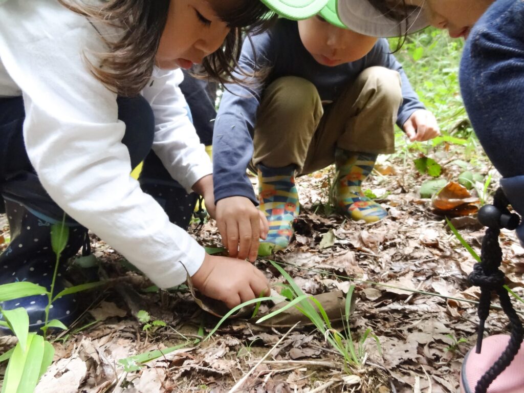 園外保育で里山や自然が多く残っている場所に出かけ、自然の中で全身を使って「見て、触れて、試して」実体験をたくさんできるようにしています。